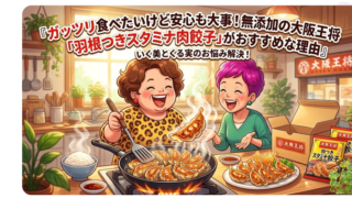 ガッツリ食べたいけど安心も大事!国産素材&5つの無添加を実現した大阪王将の肉餃子が、子育て世代に選ばれる理由とは?油不要でパリパリの羽根が焼ける驚きのタイパを、共働き主婦コンビが紹介。通販でまとめ買いして献立の悩みを解消するコツが満載です。