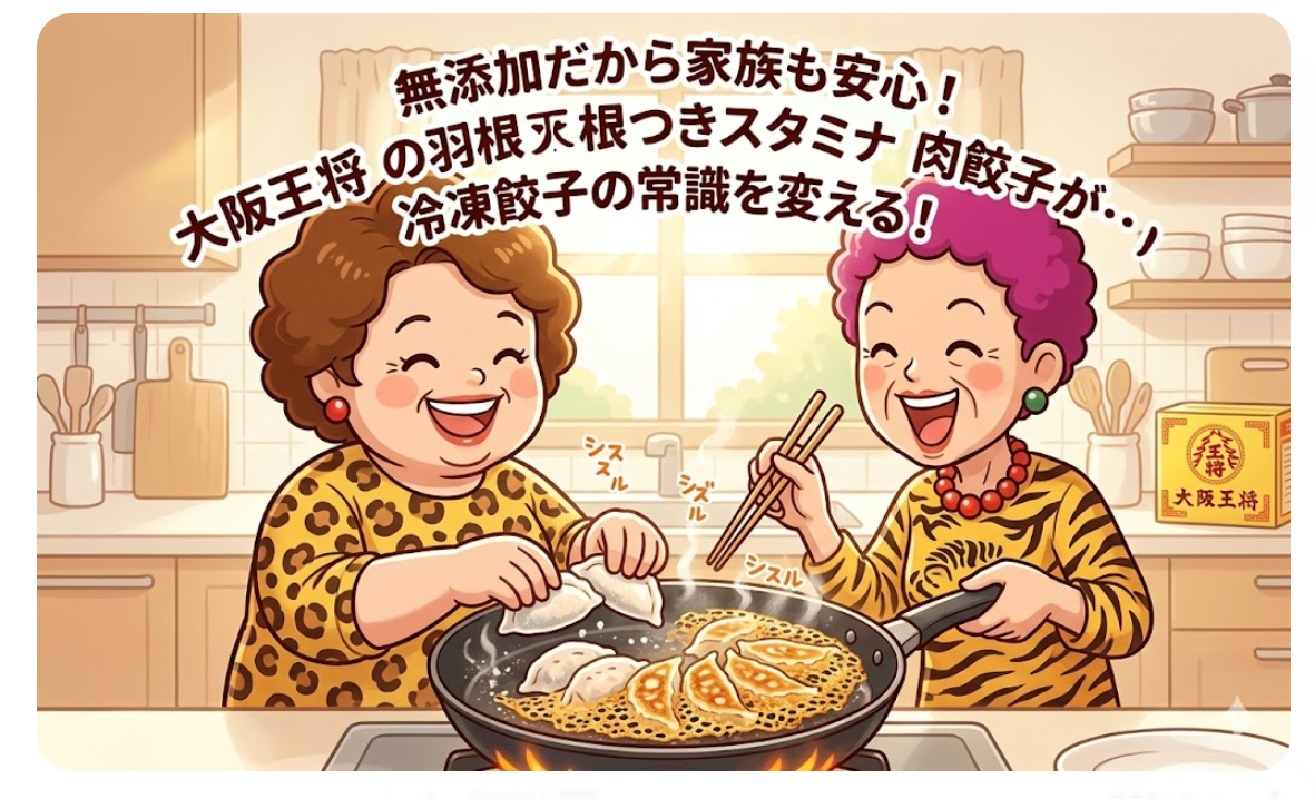 いく美:せやろ?でもな、この大阪王将の「羽根つきスタミナ肉餃子」は、ほんまに魔法みたいやねん。**「油なし・水なし」**でフライパンに並べて蓋するだけ!これだけで、誰でもお店みたいなパリッパリの羽根ができるんやで。