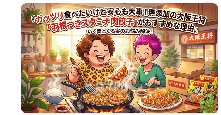 「毎日仕事に育児に大忙し。夕食の準備を少しでも楽にしたいけれど、家族には安心で美味しいものを食べさせたい……」そんな悩みを持つ共働き主婦の皆さんに、救世主となる一品をご紹介します!今回注目するのは、大阪王将の通販サイトで大人気の「羽根つきスタミナ肉餃子」です。時短・安心・ガッツリの三拍子が揃ったこの商品の魅力を、大阪の共働き主婦コンビ、いく美ちゃんとくる実ちゃんの二人が賑やかな掛け合いで徹底解剖してくれます。忙しい夕方の「手抜きに見えない裏技」や、無添加へのこだわりなど、主婦目線の本音トークをぜひ参考にしてみてください。それでは、二人の会話を覗いてみましょう!