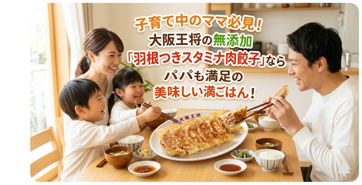 ここまで、大阪王将の「羽根つきスタミナ肉餃子」がなぜ子育て家庭に最適なのかをお伝えしてきました。