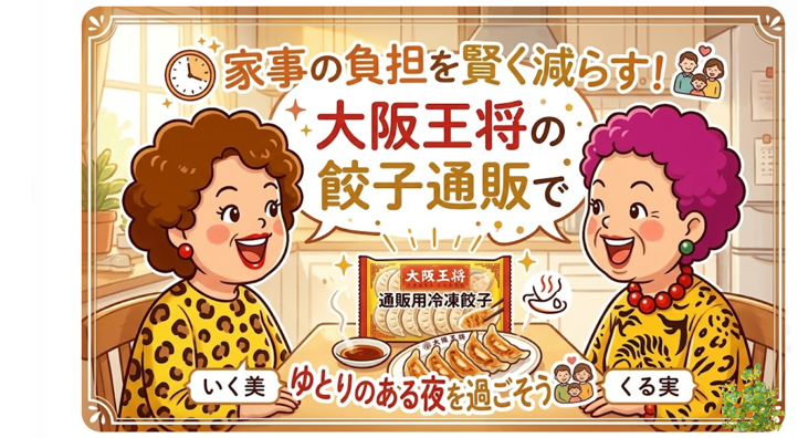 くる実ちゃん:ほんまそれ!いく美ちゃん。座る暇もないし、心にトゲが刺さったみたいにイライラしてまうわ。でもな、最近うち、大阪王将の餃子を通販でストックし始めたんやけど、これがもう「神様仏様王将様」やねん!
