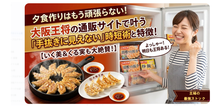 いく美:せやろ?でもな、大阪王将の通販サイトを使い始めてから考えが変わったんよ。無理してイライラしながら作った一汁三菜より、プロの力を借りて笑顔で「お待たせ!」って出す餃子の方が、家族みんな幸せそうやねん。